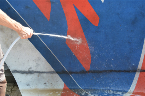 3) If the carpet is very dirty, a simple wash-down – using a water hose with a spray nozzle at a distance of 30 cm to 1 metre – will remove the remaining dirt.